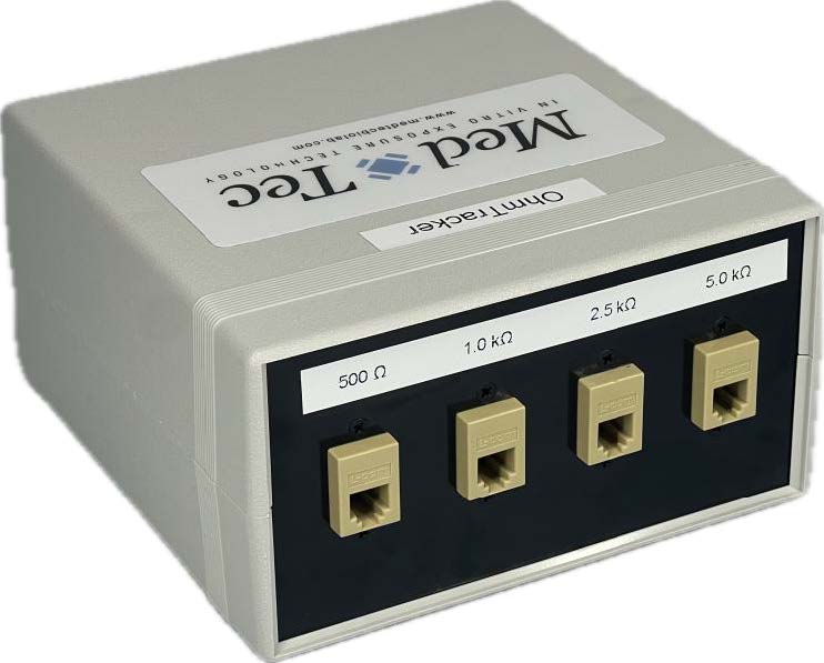 There is a need for a multi-point control resistance device to validate the accuracy of TEER measurement systems. MedTec’s OhmTracker comes with an 8-port, wide range resistance outputs of the following measurements: 10, 50, 100, 250, 500, 1000, 2500, and 5000 ohms. A 12” cable with Cat 3 connectors on both ends is used to connect the OhmTracker to your TEER measurement system. A converter cable can be used to connect to other types of connectors. Accompanied with the unit will be a Certificate of Analysis that will show the actual values measured are within 1% of nominal values. The 8-port unit is standard as it covers a wide spectrum of resistance values needed.